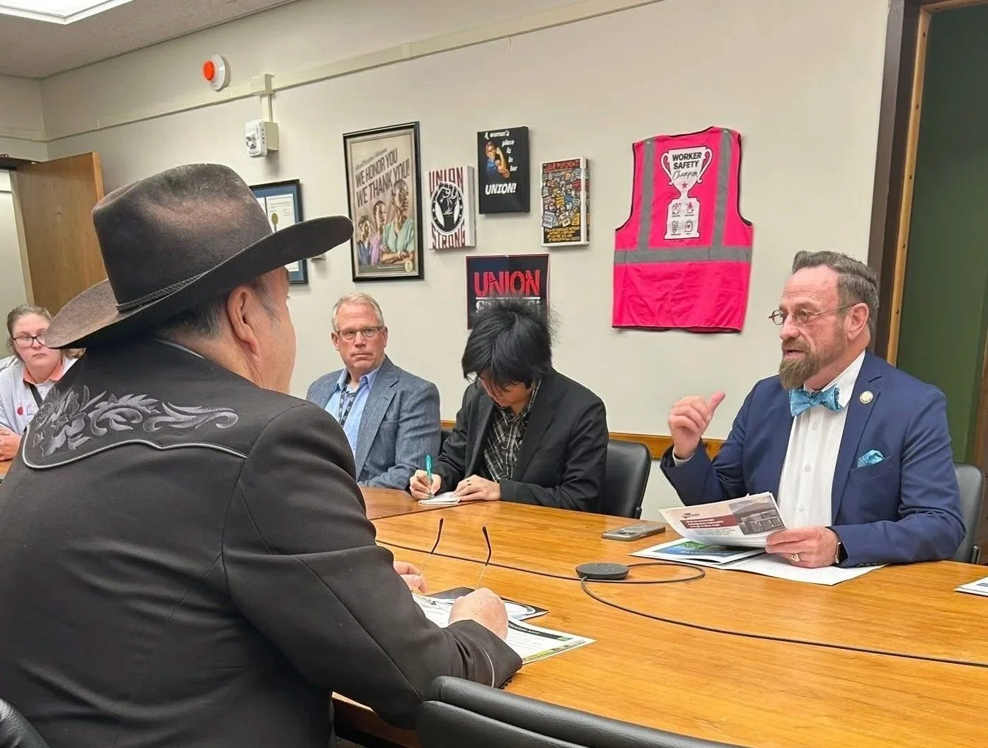 Robert Colby and the Monroe County delegation speak with Assemblyman Harry Bronson about the TEMP Act. (Photo provided by NYFB)